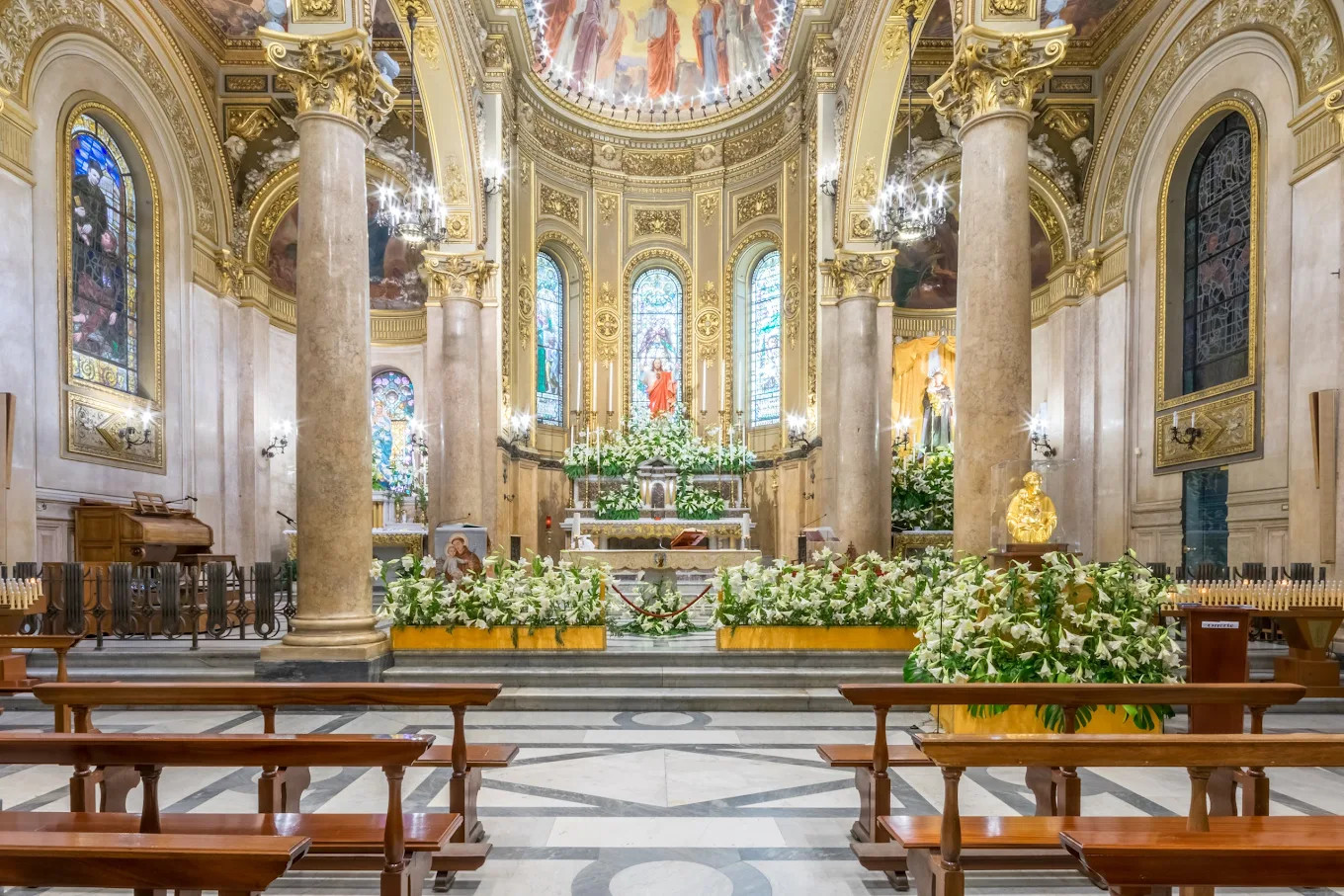 All'interno, la basilica accoglie con un'atmosfera raccolta e mistica. Le navate sono impreziosite da vetrate colorate che filtrano la luce creando giochi cromatici delicati, mentre gli altari e le decorazioni sacre raccontano episodi della tradizione cristiana e la devozione verso Sant'Antonio. Il silenzio e la luce soffusa contribuiscono a rendere lo spazio ideale per la preghiera e la meditazione.